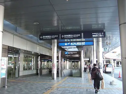 Fukuokakūkō Station (福岡空港駅, Fukuokakūkō-eki; "Fukuoka Airport Station") is a Fukuoka City Subway station serving the domestic terminal of Fukuoka Airport in Fukuoka prefecture, Japan. The station symbol is a blue airplane and a cloud. This is the only subway station in Japan which directly connects with an airport.