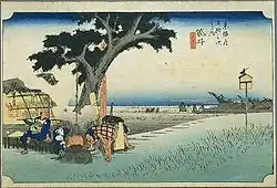 The classic ukiyo-e print by Andō Hiroshige (Hōeidō edition) from 1831–1834 depicts a couple of travelers sheltering at a wayside lean-to, in front of which a woman stirs a large kettle hung from the branch of a large tree. The surrounding area appears to be featureless rice fields, with little indication of a post town.
