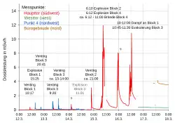 TEPCO reported that the RCIC shut down around 19:00 JST on 12 March, and that the reactor containment vessel started reducing pressure before midnight.[8] The IAEA later revealed that no venting had taken place at the plant.[9] The following day at 09:00 JST, the RCIC was reported to be operating again.[10] A New York Times report suggested that plant officials initially concentrated efforts on a damaged fuel storage pool at Unit 2, diverting attention from problems arising at the other reactors, but that incident was not reported in official press releases.[11] The IAEA reported that on 14 March at 09:30, the RCIC was still operating and that power was being provided by a mobile generator.[9] At some point during the day TEPCO reported the shutdown of the RCIC system presumably due to low reactor pressure. Operators had for days taken measures to prevent the reactor pressure from dropping below the level at which the RCIC can operate to keep it running as long as possible. The system though, was never designed to be used for an extended period.[12] Fuel rods had been fully exposed for 140 minutes and there was a risk of a core meltdown.[13] Reactor water level indicators were reported to be showing minimum-possible values at 19:30 JST on 14 March.[14] Meanwhile, radiation dose rates measured at the gate of the plant (at 21:37 JST) reached a maximum of 3.13 m Sv/h, which was enough to reach the annual limit for non-nuclear workers in twenty minutes.[13] These levels later subsided as another measurement taken at 22:35 showed a lower reading of 0.326 mSv/h.[15] Workers concurrently succeeded in refilling half the reactor with water but parts of the rods were still exposed, and technicians could not rule out the possibility that some had melted. It was believed that around 23:00 JST, the 4 m long fuel rods in the reactor were fully exposed for the second time.[13][16]