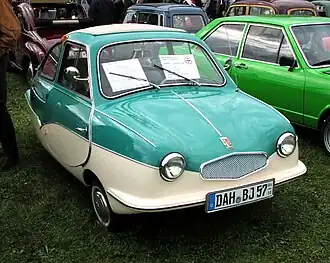 Fuldamobil is the name of a series of small cars produced by Elektromaschinenbau Fulda GmbH of Fulda, Germany, and Nordwestdeutscher Fahrzeugbau (NWF) of Wilhelmshaven between 1950 and 1969.[1] Various designated versions of the car were produced, although the vehicles produced under each designation were not always identical and the designations were sometimes misapplied.[2] Though overall numbers produced were relatively small, the cars attracted sufficient attention to see licensed construction on four continents including Europe. In its ultimate configuration it is said to have inspired the term "bubble car".[a] It is acknowledged as the first car in the world to feature a negative scrub radius, now recognised as a major advance in driving safety.[4]