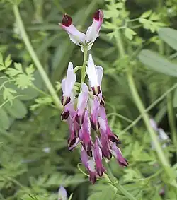 Purple ramping-fumitory was named in 1902 by H.W. Pugsley, who also described two varieties: var. longisepala, with sepals up to 6.5 mm long, and var. brevisepala, with shorter sepals only 5 mm long, which could be confused with F. muralis var. boraei.[10] The two varieties are usually ignored now. There is some debate about its origin and its relationship to other species in the genus. Some authorities consider it to be closely related to F. muralis because of chemical and cytological similarities, while others place it alongside F. capreolata, owing to their morphological similarity.[3]