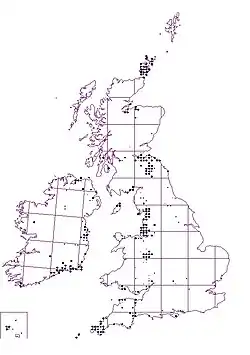 Fumaria purpurea has only been recorded in Britain, Ireland, the Isle of Man and the Channel Isles (an area sometimes referred to by naturalists as the British Isles), which makes it endemic to this area. It has a striking and unusual distribution pattern, being found in Britain mainly along a vertical line from Devon to Orkney. It grows in hedges and on disturbed ground, including gardens, arable fields and construction sites.[5][3] It was first collected in 1726 by Johann Jacob Dillenius, "ad sepes prope Shrewsbury" (in hedges near Shrewsbury, where it still occurs), according to a specimen at Oxford University (OXF)[6] which was identified much later by Pugsley.[7] In Britain and Ireland it is classed as "least concern" by the JNCC and the National Parks and Wildlife Service, respectively, while it is also listed as "vulnerable" in England and "critically endangered" in Wales.[8][9]
