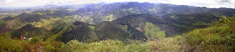 Despite its relatively small area, Fundão extends from the coast to the Serra do Castelo, a prominent geographical feature in central Espírito Santo.[91] Its terrain is highly undulating, with 61.53% of its area having a slope of less than 30%.[93] The eastern region consists of lowlands and a nearly straight coastline, except for the Flecheira point, while the western region features elevations shaped by crystalline rocks.[4] Located 13 kilometres (8.1 mi) from the seat, on the border with Santa Teresa, is the Pico do Goiapaba-Açu, a granite formation[4] rising 850 metres (2,790 ft),[94] offering views of the region between Greater Vitória and Linhares.[91]