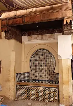 Inside, the building is centered around a large courtyard with a disposition similar to the interior of the Funduq al-Najjariyyin. The building has three floors (including the ground floor). On the southern wall of the ground floor, opposite the entrance, is a monumental decorative niche covered in zellij, carved stucco, and sculpted wood, reminiscent of decorated street fountains.[3] The courtyard is ringed by a gallery which stretches across all three floors and whose pillars are adorned, in their upper parts, with more carved stucco decoration.[1][3] This gallery in turn grants access to over two dozen rooms distributed across the three floors.[2]