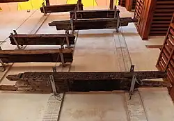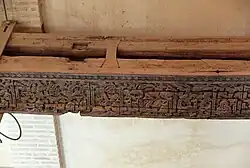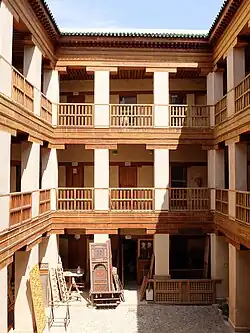 The Funduq Shamma'in has been seriously damaged by fires at least twice in its history, the last of which was in 1974.[2][1] The only part of the building to survive relatively intact was its entrance vestibule, which preserved important examples of Marinid-period carved decoration in cedar wood and an inscription in Kufic Arabic script.[2] Both the Funduq Shamma'in and the Funduq Sbitriyyin were most recently restored in 2016 and reopened in 2018 as centers for traditional crafts in the medina of Fes.[6][5][10][7] Since the restoration, the Funduq Shamma'in's original woodwork elements are on display in the courtyard.[7]