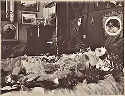 On 25 January, her body was lifted into the coffin by her sons Edward VII and Prince Arthur, Duke of Connaught, and her grandson the German Emperor Wilhelm II.[6] She was dressed in a white dress and her wedding veil.[7] An array of mementos commemorating her extended family, friends and servants were laid in the coffin with her, at her request, by her doctor and dressers. A dressing gown that had belonged to her husband Albert, who had died 40 years earlier, was placed by her side, along with a plaster cast of his hand, while a lock of John Brown's hair, along with a picture of him, was placed in her left hand concealed from the view of the family by a carefully positioned bunch of flowers.[8][9] Items of jewellery placed on Victoria included the wedding ring of John Brown's mother, given to her by Brown in 1883.[8]