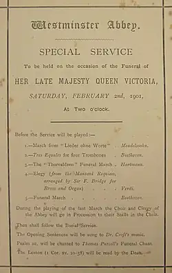 The service, on the afternoon of Saturday 2 February at St George's Chapel, followed the liturgy of the Burial Service in the Book of Common Prayer and was the first royal funeral for which a printed order of service had been produced. The organisation of the service lay with the Dean of Windsor and the Lord Chamberlain, with the active participation of the Archbishops of Canterbury and York.[18] The music started with the first of the funeral sentences by William Croft, and Psalm 15 to a setting by William Felton. After the lesson came further funeral sentences sung as anthems; Man that is born by Samuel Sebastian Wesley and Thou knowest Lord by Henry Purcell. The Lord's Prayer in Latin by Charles Gounod, and the anthem How blest are they by Pyotr Ilyich Tchaikovsky followed. After the Garter Principal King of Arms had proclaimed the Queen's styles and titles, the anthem Blest are the departed by Louis Spohr was reportedly followed by the Dresden amen. The inclusion of so much music by foreign composers was unprecedented, and was not repeated in later royal funerals, where British music predominated. At the end of the service, a funeral march attributed to Ludwig van Beethoven but actually by Johann Heinrich Walch was played instead of the traditional "Dead March" from Saul because Victoria was known to dislike Handel's music and was reported to have forbidden its use at her funeral.[19]