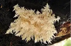 Hericium novae-zealandiae, Pekepeke-kiore in Māori, or fungus icicles more commonly, can grow between 5–25 cm in diameter.[4] They are found in the autumn months of the Southern Hemisphere (March–July) and were harvested by Indigenous Māori as a food source.[4] This fungus is a decomposer, breaking own dead wood to provide energy to create its unique fruiting bodies on rotting trees. This mushroom has been experimented on both in cuisine and medicine with potential antibacterial properties.[13]