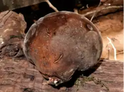 One of the many species that grow on native beech (Nothofagus) trees, pūtawa grows on dead logs for weeks until it reaches its maximum size.[9] Found in the North Island and locally just north of Christchurch in the South Island, this bracket fungi can grow up to 30 cm across and 6 cm thick.[4] Māori used these fungi as a fire starter when moving around, as the fungus burns very slowly and is hard to put out, requiring complete smothering. Similar species found elsewhere in the world have been known to have this same purpose – including lighting cigarette papers.[10] There are records of this fungus being used for medicinal purposes, specifically to maintain pressure on bleeding wounds with strips of pūtawa acting as a naturally absorbent and elastic bandage.[11] Because this species falls from their host when mature, this has made getting a reliable sequence in the New Zealand Fungarium collections difficult.[8]