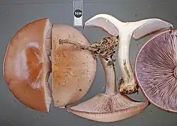 The wood blewit can be found in dense leaf litter around urban areas, found in Auckland, Waikato, Manawatu, Wellington, Nelson, Tasman, Marlborough, Canterbury, and Otago.[4] With a cap diameter of 4–15 cm this blewit is relatively large and is under research for antimicrobial and antioxidant compounds.[70][71] Aside from these medicinal qualities, this mushroom is eaten around the world and noted for its sweet, floral flavour.[72]