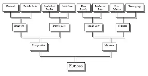 Furioso was sired by the English Thoroughbred stallion Precipitation (1933 – 1957), an influential sire who is found in the pedigrees of many racehorses and sport horses today. He was responsible for helping maintain the Matchem (1748 – 1781) and Godolphin Arabian sireline.