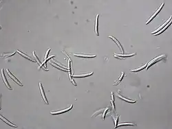 F. solani has aerial hyphae that give rise to conidiophores laterally.[1] The conidiophores branch into thin, elongated monophialides that produce conidia.[1][9] Phialides that produce macroconidia are shorter than those that produce microconidia.[1] The macroconidia produced by F. solani are slightly curved, hyaline, and broad,[1] often aggregating in fascicles.[10] Typically the macroconidia of this species have 3 septa but may have as many as 4–5.[1][10] Microconidia have thickened basal cells and tapered, rounded apical cells.[1] However, some F. solani isolates have pointed, rather than rounded, macroconidia.[1] Microconidia are oval or cylindrical, hyaline, and smooth.[1] Some microconidia may be curved.[1] Microconidia typically lack septa, but occasionally they may have up to two.[1] Fusarium solani also forms chlamydospores most commonly under suboptimal growth conditions.[10] These may be produced in pairs or individually.[9][10] They are abundant, have rough walls, and are 6-11 μm.[1] F. solani chlamydospores are also brown and round.[11]