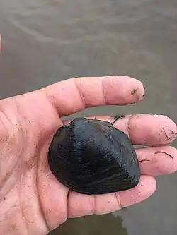 Narrow pigtoe has a triangular to square shape with a black to reddish-brown color. Narrow pigtoe reaches approximately 75 millimetres (3.0 in) in length as an adult. Its shell is moderately thick with a white- to salmon-colored interior.[6] Narrow pigtoe also has a rainbow pattern near the base of the interior shell.[6]