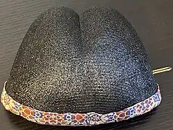 | Yishan guan (翼善冠; 'winged shan hat') | A type of futou made of lacquered silk which is formed on a wooden frame. At the back of the hat, there is a tall extension which is molded into 2 symmetrical bulbous shapes; there are 2 ribbons which are fastened to the hat's lower back and straight up extending just beyond the top protrusion.[3]: 102 It is also a type of guan. | ![]()