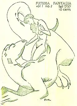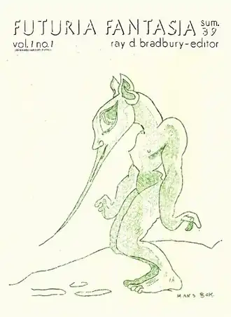The first issue was published in June 1939, receiving "fairly good feedback from local and long-distance subscribers."[4] Indeed, Henry Hasse, a pulp writer from Seattle, wrote to Bradbury for a copy of the issue, and at Bradbury's prompting, offered feedback on the young editor's first attempt at publication. Hasse would go on to contribute to the second and third issue under the pseudonym Foo E. Onya. The covers of the first issue—and all subsequent issues—were illustrated by Hannes Bok, who would become famous for his work on pulp and science fiction magazines.[5]