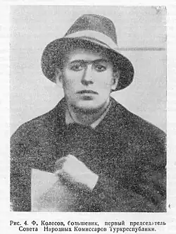 Fyodor Ivanovich Kolesov (Russian: Фёдор Иванович Колесов) (Uralsk, 20 May 1891 – Moscow, 29 July 1940) was a Russian revolutionary, Soviet politician and party official, who was one of the organizers of the struggle for Soviet power in Turkestan during the Russian Revolution. He was a member of the Communist Party since 1917.[1]