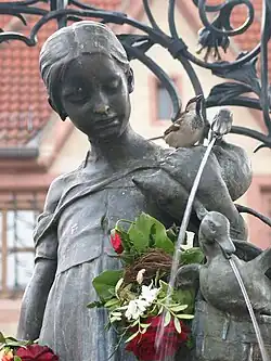 The Gänseliesel (English: Goose Girl, Goose Lizzy (Liesel as pet name of Elisabeth)) is a fountain which was erected in 1901 in front of the medieval town hall of Göttingen, Germany. Although rather small in size, the fountain is the best-known landmark of the city. Today, it is an essential part of graduation celebrations, as it is traditional for students who complete a doctorate at the University of Göttingen to climb the fountain and kiss the statue of the goose girl.[1]