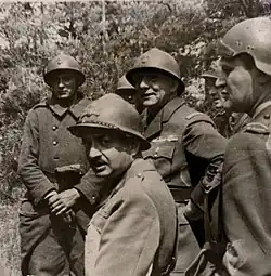 In 1915, de Lattre responded to an appeal for cavalry officers to volunteer for service in the infantry, and he joined a Vendée regiment, the 93rd Infantry Regiment.[13] He was promoted to captain on 18 December 1915,[9] and was a company commander and then assistant battalion commander in its 3rd Battalion.[14] As part of the 21st Infantry Division, the 93rd Infantry Regiment fought in the Battle of Verdun, where he was gassed in July 1916. The mustard gas affected his injured lung, necessitating time in hospital. He was back with the 21st Infantry Division in time to participate in the ill-fated Nivelle offensive in April 1917.[13] In an attack on 5 May, his battalion suffered 300 casualties, but captured 500 prisoners. De Lattre received his eighth mention in despatches.[15] He was hospitalised again that month, and did not return until December, when he became an intelligence officer on the 21st Infantry Division staff. The division was decimated in the Third Battle of the Aisne in May 1918, but it was reconstituted and fought in the Meuse-Argonne offensive later that year, during which de Lattre liaised with the staffs of three divisions of the United States Army.[13]
