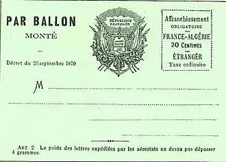 The address side of a balloon post card from the 1870 siege of Paris during the Franco-Prussian War.
