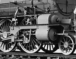 In order to provide enough power at high speeds, the 210, like its immediate predecessors, was a four-cylinder compound. The two high-pressure cylinders were mounted inside the frames, with the low-pressure ones outside; both drove the second coupled axle.[10] Unlike its predecessor, the two outer cylinders were now located horizontally, helping to reduce hammer blow; the inner ones were still located at an angle of 1:8.5 to the horizontal, to avoid the first coupled axle. The cylinders on each side were quartered at 180° to each other.