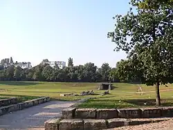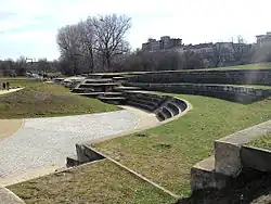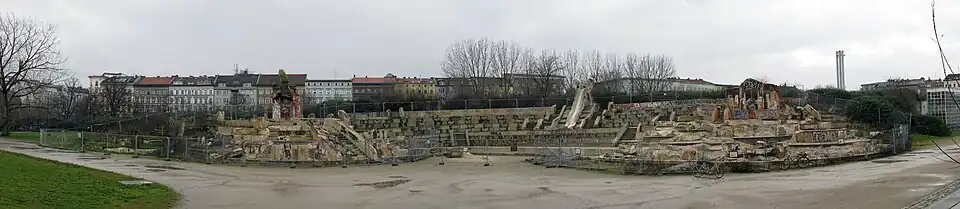 The Pamukkale fountain, created by the sculptor Wigand Witting from 1994 to 1997 and completed in 1998, was one of the main design elements in Görlitzer Park. It was inspired by the travertine terraces of Pamukkale, Turkey and became a special place of remembrance for the many citizens of Kreuzberg with Turkish ancestry. Due to a faulty substructure and lack of drainage for the foundations, as well as problems with the Portuguese limestone used, the construction was so badly damaged by its first winter that it had to be closed to visitors for security reasons. For a long time, there was a dispute over the restoration.[8] In October 2000, the artist was sentenced to pay damages in the amount of 1.1 million euros. This sentence was confirmed again in November 2008.[9][10] In autumn 2009, the crumbled fountain construction was removed along with the sculptures that were still intact at the time. The demolition was not without controversy, and led to demonstrations. Unknown activists poured large amounts of red paint down the terraced landscape as a sign of the bleeding out of a significant work of art for the integration and diversity of Berlin's cultures.