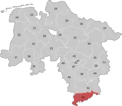 Göttingen is located in southern Lower Saxony. As of the 2021 federal election, it comprises the district of Göttingen excluding the municipalities of Bad Grund, Osterode am Harz, and Walkenried, the Samtgemeinde of Hattorf am Harz, and the Harz area.[1]