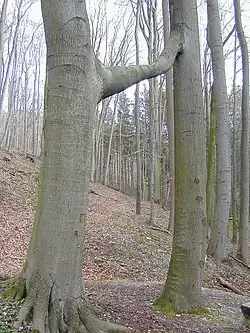 The Göttingen Forest is bounded to the north, east and south predominantly by steep hillsides. The exact boundary of the forest is, however, not always uniformly defined. For example, on the one hand, many define it in a narrow sense as only that part south of the B 27 excluding the Plessforst,[1] on the other hand, others refer to the climbing region of Göttingen Forest, an area also including those woods to the north, east and south.[2]
