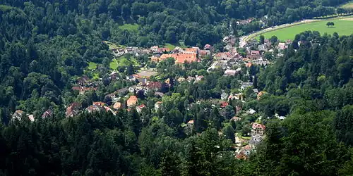 The village Günterstal is the southernmost district of Freiburg im Breisgau. It is located in the so-called Bohrer-Tal area (where the craft of "Deichel-Bohrer", preindustrial wooden water pipes used for the distribution of water, took place) at the foot of the 1284 metre-high Schauinsland in the Günterstal district of the Black Forest. Due to this, Freiburg prides itself on being Germany's highest city. Günterstal has more than 2,000 inhabitants and is separated from Freiburg by a two-kilometre-wide meadow, the "Wonnhaldewiesen". The village was incorporated into Freiburg in 1890. The southern neighbouring municipality is Horben.