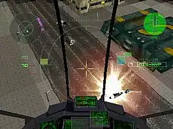 The game's aircraft comes with numerous weapons which are upgraded as the player progresses to more difficult levels.[9] An improved version of the basic "Havoc Gunship" aircraft (the "Venom Gunship") is also available later in the game.[7] Missions include seeking out and destroying enemies, escorting friendly ground units, preventing smuggling and bomb disposal.[7][5] The player receives updates and new instructions as the mission proceeds.[8] The main game mode features 35 missions and an additional training mode.[9] Most of the game's missions take place in urban "domes" filled with large buildings; some, however, take place in the "outer domes", with other themes such as agrarian settings.[8]