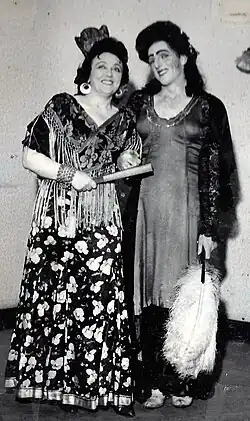 Shortly after V-E Day Lt. Robert T. Bogan, 253rd Special Services officer, directed his assistant, T/5 Frederick Wiener (aka Fredd Wayne), to organize an entertainment for the regiment. Sgt. Joe Pollock, co-collaborator with Wayne on Special Services theatricals during the 253rd’s training stint in Mississippi, joined Wayne in planning a show based on Wayne’s idea of a burlesqued version of Bizet's opera Carmen. Flyers were posted seeking volunteers for cast and crew in "Carmen – a Boilesk Voishin”.[1] Of the 45 GIs in the cast about half would perform in drag but none wanted the title role, so Wayne became the U.S. Army’s Carmen in addition to co-producing and directing the show.