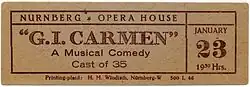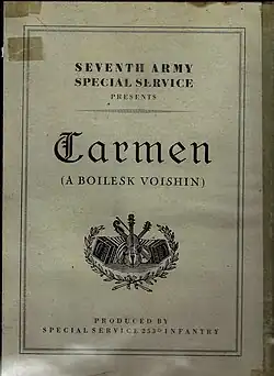 The cover of the first program read: "Carmen (A Boilesk Voishin) presented by special Services 253d Infantry"; and, on page 2: "The Slopopolitan Opera Association (alias Special Services 253d Inf.) presents a F___________ up version of Bizet's opera Carmen in 3 acts."[12] Programs for G.I. Carmen changed through its run as it was taken over by the 7th Army and TSFET Special Service, entr'actes and musical numbers were added, and high point men were sent home.