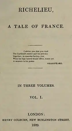 - Richelieu: A Tale of France (3 volumes, 1829)
