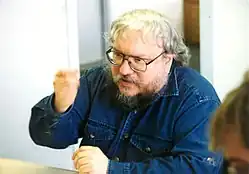 Martin is a member of the Science Fiction and Fantasy Writers of America (SFWA); he served as the organization's Southwest Regional Director from 1977 to 1979, and as its vice-president from 1996 to 1998.[43] In 1976, for Kansas City's MidAmeriCon, the 34th World Science Fiction Convention (Worldcon), Martin and his friend and fellow writer-editor Gardner Dozois conceived of and organized the first Hugo Losers' Party for the benefit of all past and present Hugo-losing writers on the evening following the convention's Hugo Awards ceremony. Martin was nominated for two Hugos that year but lost both awards, for the novelette "...and Seven Times Never Kill Man" and the novella The Storms of Windhaven, co-written with Lisa Tuttle.[44] Although Martin often writes fantasy or horror, a number of his earlier works are science fiction tales occurring in a loosely defined future history, known informally as "The Thousand Worlds" or "The Manrealm".
