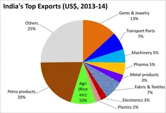 The economy of India is a developing mixed economy with a notable public sector in strategic sectors.[52] It is the world's fourth-largest economy by nominal GDP and the third-largest by purchasing power parity (PPP); on a per capita income basis, India ranked 136th by GDP (nominal) and 119th by GDP (PPP).[53] From independence in 1947 until 1991, successive governments followed the Soviet model and promoted protectionist economic policies, with extensive Sovietization, state intervention, demand-side economics, natural resources, bureaucrat-driven enterprises and economic regulation. This is characterised as dirigism, in the form of the Licence Raj.[54][55] The end of the Cold War and an acute balance of payments crisis in 1991 led to the adoption of a broad economic liberalisation in India and indicative planning.[56][57] India has about 1,900 public sector companies,[58] with the Indian state having complete control and ownership of railways and highways. The Indian government has major control over banking,[59] insurance,[60] farming,[61] fertilizers and chemicals,[62] airports,[63] essential utilities.[64] The state also exerts substantial control over digitalization, telecommunication, supercomputing, space, port and shipping industries,[65] which were effectively nationalised in the mid-1950s but has seen the emergence of key corporate players.[54][55][66]