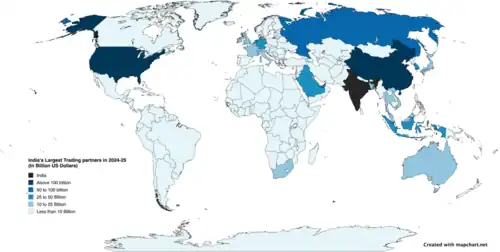 In 2021–22, the foreign direct investment (FDI) in India was $82 billion. The leading sectors for FDI inflows were the Finance, Banking, Insurance and R&D.[90] India has free trade agreements with several nations and blocs, including ASEAN, SAFTA, Mercosur, South Korea, Japan, Australia, the United Arab Emirates, and several others which are in effect or under negotiating stage.[91][92]