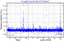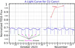 - ^ Qian, S.-B.; Zhang, J.; et al. (July 2012). "Optical flares and flaring oscillations on the M-type eclipsing binary CU Cancri". Monthly Notices of the Royal Astronomical Society. 423 (4): 3646–3651. Bibcode:2012MNRAS.423.3646Q. doi:10.1111/j.1365-2966.2012.21157.x.