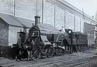 The Great Northern Railway (GNR) No. 1 class Stirling Single is a class of steam locomotive designed for express passenger work. Designed by Patrick Stirling, they are characterised by a single pair of large (8 ft 1 in) driving wheels which led to the nickname "eight-footer". Originally the locomotive was designed to haul up to 26 passenger carriages at an average speed of 47 miles per hour (76 km/h).[1] They could reach speeds of up to 85 mph (137 km/h).[2]