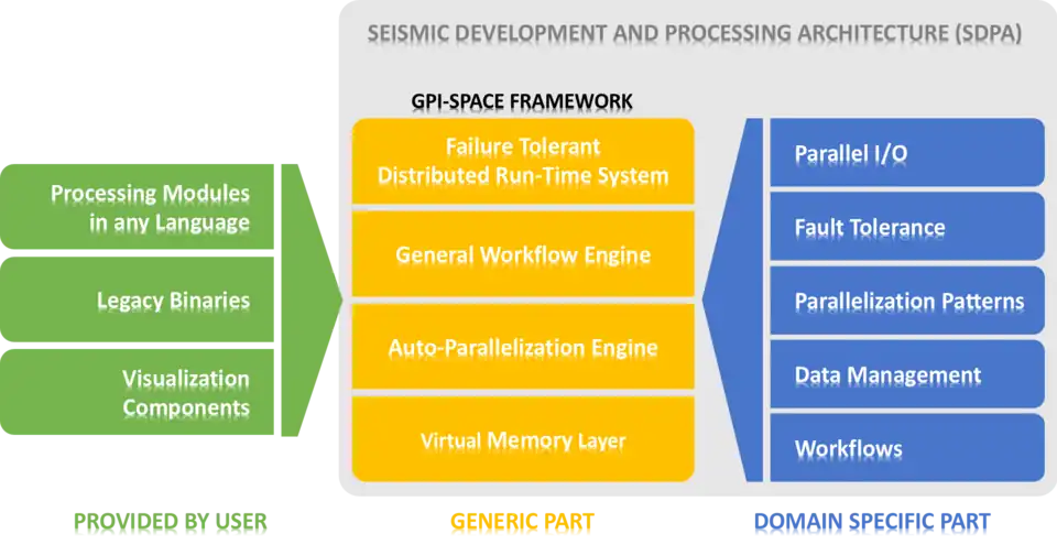 To showcase the validity of the GPI-Space approach, Fraunhofer first introduced it as part of the Seismic Development and Programming Architecture (SDPA) during SEG 2010 in Houston, TX to the community. In the seismic domain exist countless legacy algorithms and codes in a variety of programming languages that have been developed over years, but that are not parallelized. Due to limited resources, it is often not feasible to rewrite those codes from scratch in a parallel version and one single programming language.
