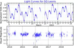 In 2001, the star was reported to show low-amplitude photometric variations with a period of 4.45 days. It was suspected that the star was a BY Draconis variable due to the period paired with the X-ray and EUV emissions.[11] This was confirmed in 2004 in a paper which also newly classified HD 77191 and V573 Puppis as BY Dra variables.[14] The star received its variable-star designation GQ Leonis in 2003.[17]