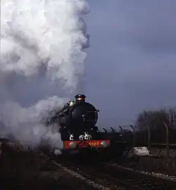 GWR 4073 Class 5029 Nunney Castle is a Great Western Railway Castle Class steam locomotive. It was built at the GWR's Swindon Works in 1934, being outshopped on 28 May and being named after Nunney Castle near Frome, Somerset. The locomotive was used in many publicity and "life on the railway" type of photographs. During the first day of the evacuation of civilians during World War II, the locomotive hauled trains carrying children being taken from London to the safety of the countryside. Nunney Castle was also used to haul the Royal Train in October 1957 from London Paddington station to Gloucester.