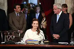 Later she went to the Casa Rosada, where the received the presidential attributes in the White Hall at the hands of the Temporary President of the Senate, Federico Pinedo, President of the Chamber of Deputies Emilio Monzó and President of the Supreme Court Ricardo Lorenzetti. Minutes later she and the President went to the historic balcony where thousands of people waited in the Plaza de Mayo.[17]