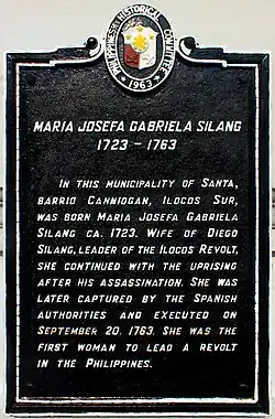María Josefa Gabriela Cariño de Silang (Tagalog: [siˈlaŋ]; March 19, 1731 – September 20, 1763) was a Filipino military leader best known for her role as the female leader of the Ilocano independence movement from Spain. She took over from her second husband Diego Silang after his assassination in 1763, leading her people for four months before she was captured and executed by the colonial government of the Captaincy General of the Philippines.