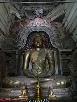 At the entrance to the shrine room is an elaborately ornate sculptured Makara Thorana (Dragon's Arch).[11] The Makara Thorana is decorated with images of Brahmā, Śakra, Santuṣita, Saman, Santhusthika, Natha and Maitreya.[12] Inside the shrine room is a 2.43 m (8.0 ft) high statue of a seated Buddha, in the 'Dhyana Mudra’ pose, the posture of meditation associated with his first enlightenment,[11] with four standing Buddha statues flanking it. The statue is significantly different from those of the Gampola period (1314–1415).