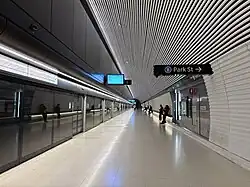 By the end of 2021, Pitt Street station's platforms, which were made out of 681 precast concrete sections, were built, and the concrete slabs for the tracks had been poured.[18] By November 2022, the platform screen doors were in place and the southern entrance building's structure was complete. Five out of the southern entrance's six escalators were also in place, with the final escalator planned to be installed by the end of 2022. Over the following months, the eight escalators at the northern entrance were planned to be installed.[19]