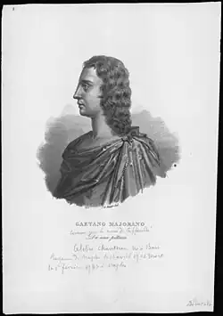 Caffarelli was born Gaetano Carmine Francesco Paolo Majorano to Vito Majorano and Anna Fornella in Bitonto.[1] His early life is uncertain. His stage name, Caffarelli, is said to be taken from an early teacher Caffaro who taught him music in childhood, others say it was taken from a patron, Domenico Caffaro. There is evidence that he personally desired to be castrated. When aged ten, he was given the income from two vineyards owned by his grandmother, according to the legal document, so that he could study grammar and, especially, music: "to which he is said to have a great inclination, desiring to have himself castrated and become a eunuch".[2] He became the pupil of Nicola Porpora. According to legend, Porpora kept the young Caffarelli working from one sheet of exercises for six years, and then eventually declared: "Go, my son: I have no more to teach you. You are the greatest singer in Europe".[3]