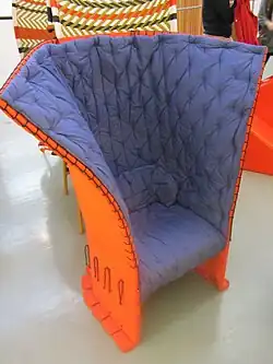 Pesce's iconic feminist armchair - a fulsome bulbous form and attached ball-shaped ottoman – alternately referred to as La Mamma, Big Mama, Donna, and Up chair – continues to inspire interpretation nearly 50 years after its creation.[37] According to curator and author of SuperDesign, Maria Cristina Didero, "Pesce wanted to produce something about the condition of women in the world. The chair can be read as the mother, and the stool her child. But it could also be a ball and chain [suggesting] woman and the prison she was obliged to live in."[38]