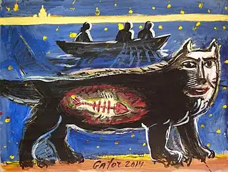 An avant-garde artist of Leningrad, Mendagaliev’s style is naïve. Vibrant colors and thick, heavy strokes form simple scenes that feel more symbolic than real.In each painting, there are repeated motifs: a table, a chimera, women, a bird, a fish. There appears to be a story begging to be told about the city he has lived in for so long, and, perhaps, a painful one. In the paintings, faces of people look in different directions, they pull from each other, guiding the viewer’s eyes into a chaos as the sphinx overlooks it all with a sense of doom. Then, there are portraits of chimeras and demons stalking individuals on the metro, women tormented next to a table or underwater beneath a fish in flight. They have a sinister tone to them. Fantastical, but simple, Mendagaliev’s works linger in the mind and resurface in the memory of St. Petersburg as a city.[3]