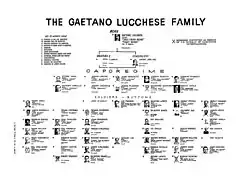 After the murder of Masseria, a Mafia meeting was hosted by Maranzano, and he proclaimed himself the new Capo di tutti capi (boss of all bosses) of the American Mafia.[16] Maranzano outlined a peace plan to all the Sicilian and Italian Mafia leaders in the United States.[17] There would be 24 organizations (to be known as "families") throughout the country who would elect their own bosses. Maranzano also reorganized all the Italian-American gangs in New York City into five families to be headed by Lucky Luciano, Vincent Mangano, Joseph Profaci, Gagliano, and himself. Gagliano was awarded the old Reina organization, with Lucchese as his underboss.
