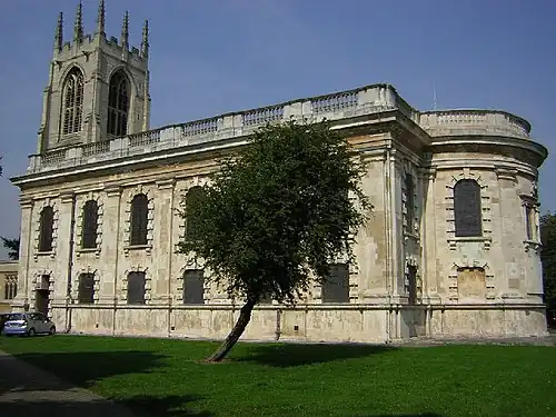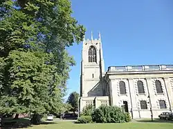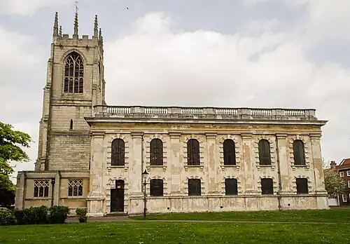 The medieval Church of All Saints fell into disrepair after the Civil War. In 1736 it was demolished to make way for a new parish church completed in 1748 in a mix of perpendicular Gothic and Classical Revival styles. All that remains of the medieval church is the west tower, 90 feet high with a ring of eight bells. A monument to Richard Rollett, master sailmaker on Captain James Cook's second voyage, is located in the porch.[14] All Saints remains the main parish church of the town.