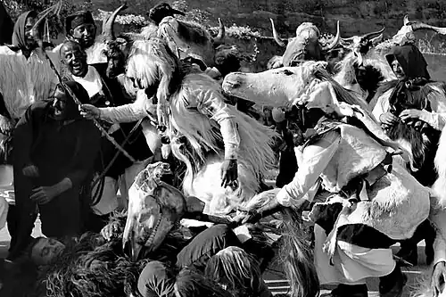 This character is put on chains by other characters, the good ones (is maimulus). These characters represent good spirits protecting the community. They also wear animal skins and animal heads (cows, sheep, goats or other horned animals) and lot of bells in their back. During the representation they advance with a regular rhythm (given by the bells on their backs) and beat the bad character, forcing him to follow their rhythm.
